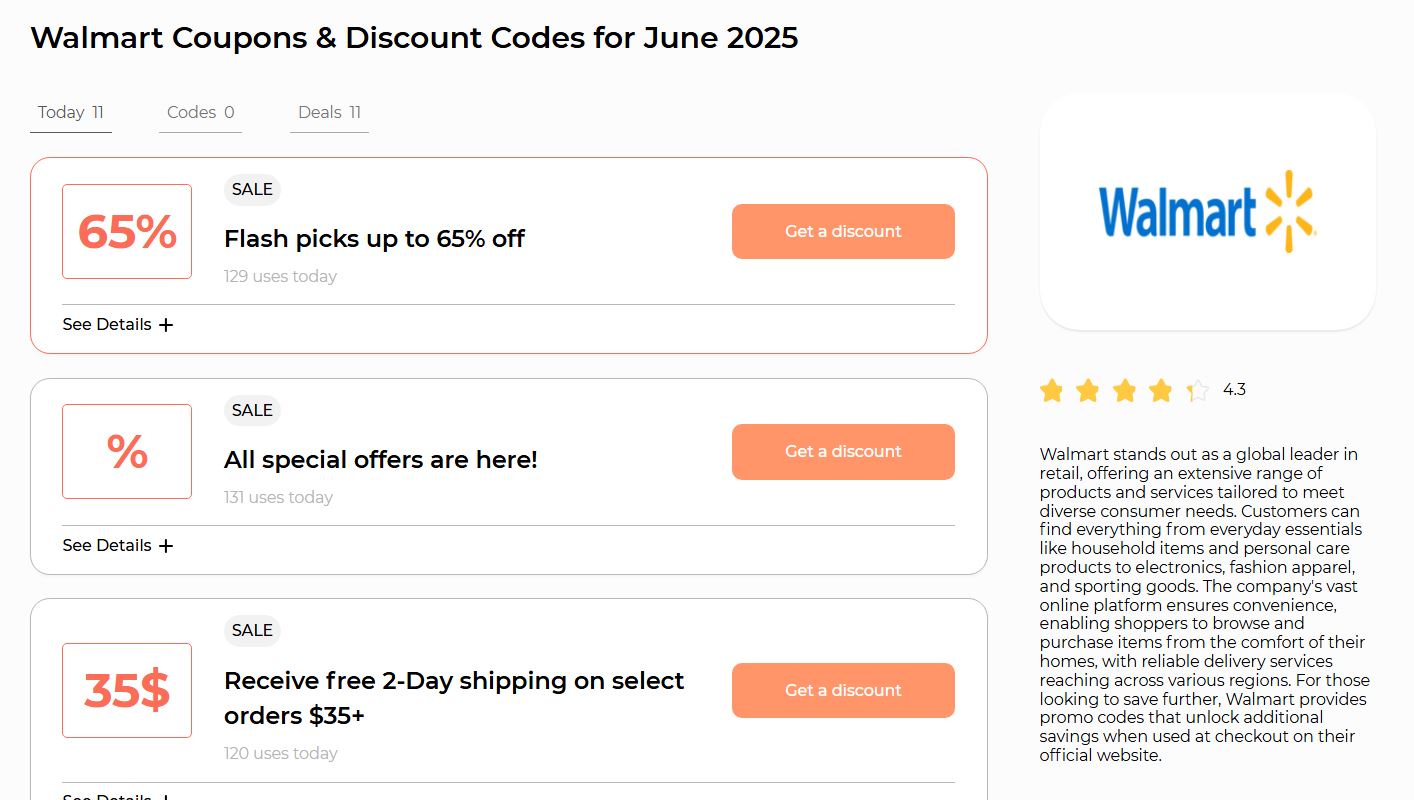 To maximize savings on purchases, use Walmart promo codes that can be found on the adventuresofacouponista.com website. Our service regularly updates the list of current coupons and discounts. Simply visit the page, select an appropriate promo code, copy it, and apply it when placing your order on the Walmart website in the special "Promo Code" field. Check this page regularly to not miss new advantageous offers and exclusive promotions.